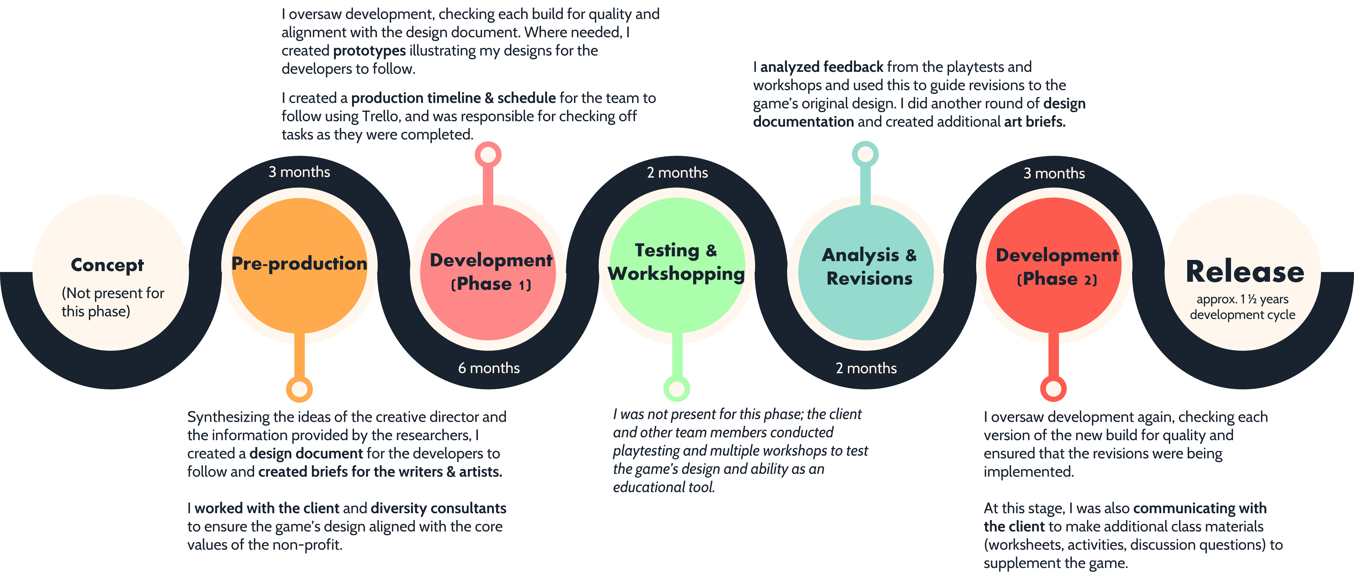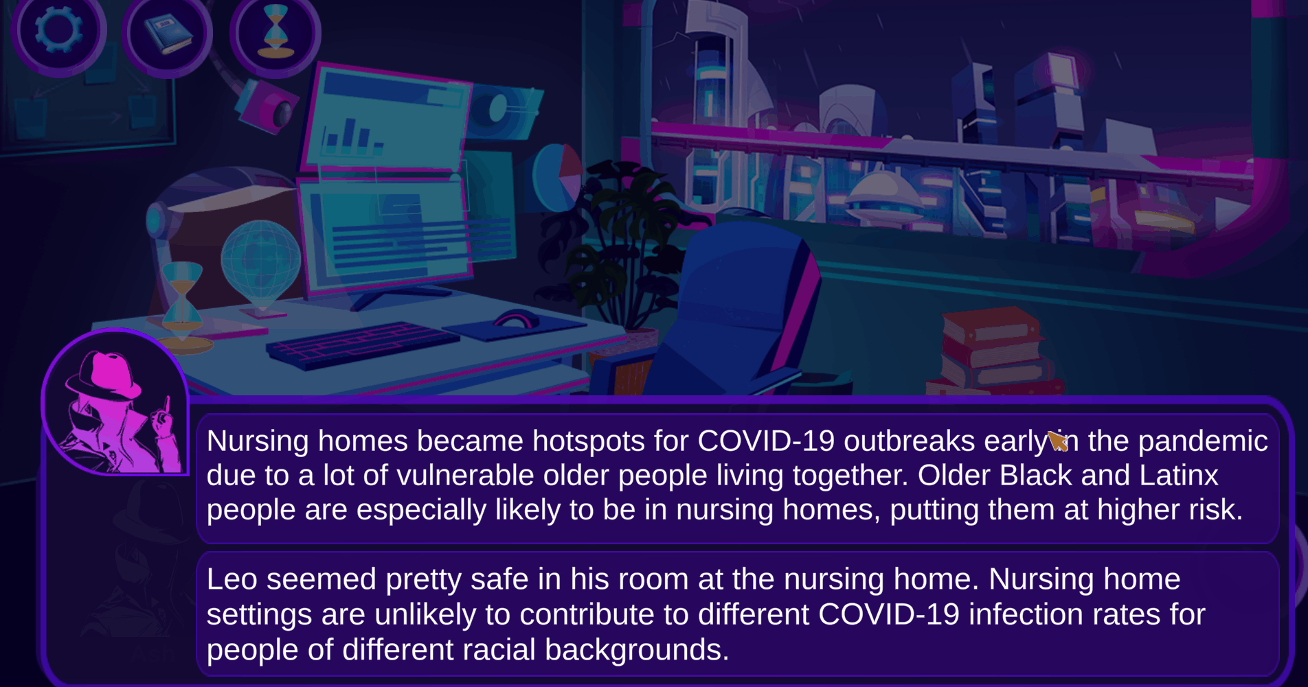 This game is an educational tool for middle-school teachers to use in classrooms to teach students about structural racism in the United States through the lens of COVID-19. It was commissioned by the non-profit organization, EmbraceRace. As a serious game, I worked closely with both the client and the researchers to ensure the game’s design fulfilled its educational purpose.