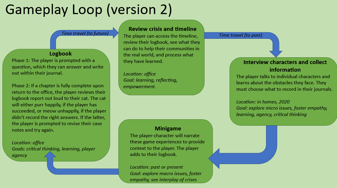 - Create a tool for teachers. Games cannot replace a teacher; rather, this is a tool for teachers to use. The game creates an output of each student’s choices, answers, and journal entries, serving as content for teachers to review.
