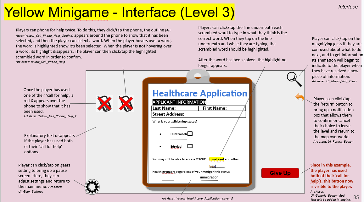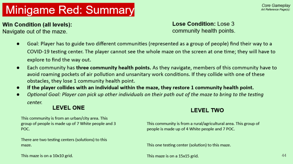 My primary task for this game was to create the game design document (GDD), created in PowerPoint / Google Slides for a total 300+ slides in addition to supplementary material (scripts, artist briefs, etc). I treat GDDs as living documents, updating them as development continues and the team and client collaborate to iterate upon the design.