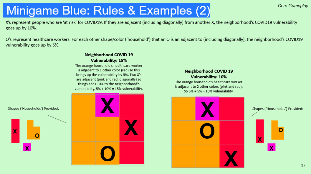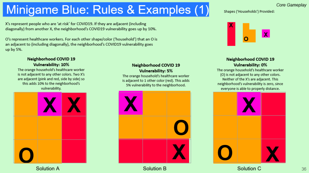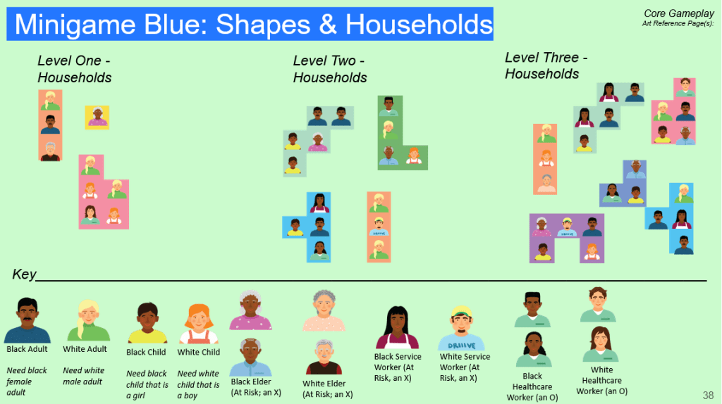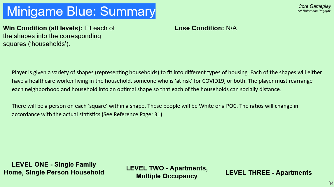 People of color are more likely to live with healthcare & front-line workers, in multi-family housing, and in inter-generational households. This causes these communities to be more susceptible to the virus than white families, who are more likely to live in single-family housing. This was depicted through the game’s mechanics, as each shape was representative of a household (based on actual statistics) and each level/puzzle depicted a different kind of housing: the smaller grids (single-family housing) could be solved without ever increasing the neighborhood’s vulnerability; whereas the larger grids (apartment buildings, like the one depicted below) could not be solved without increasing the neighborhood’s vulnerability.