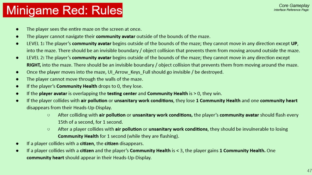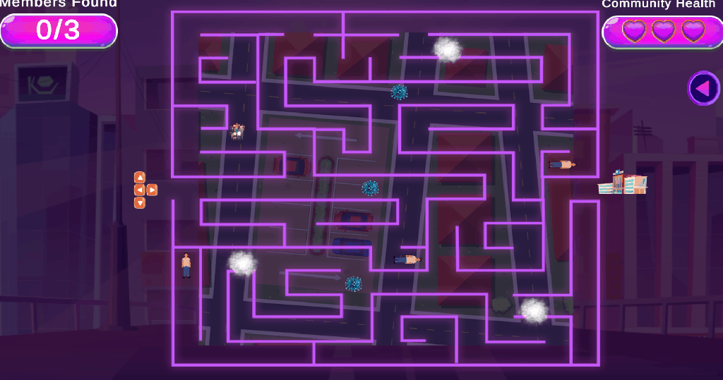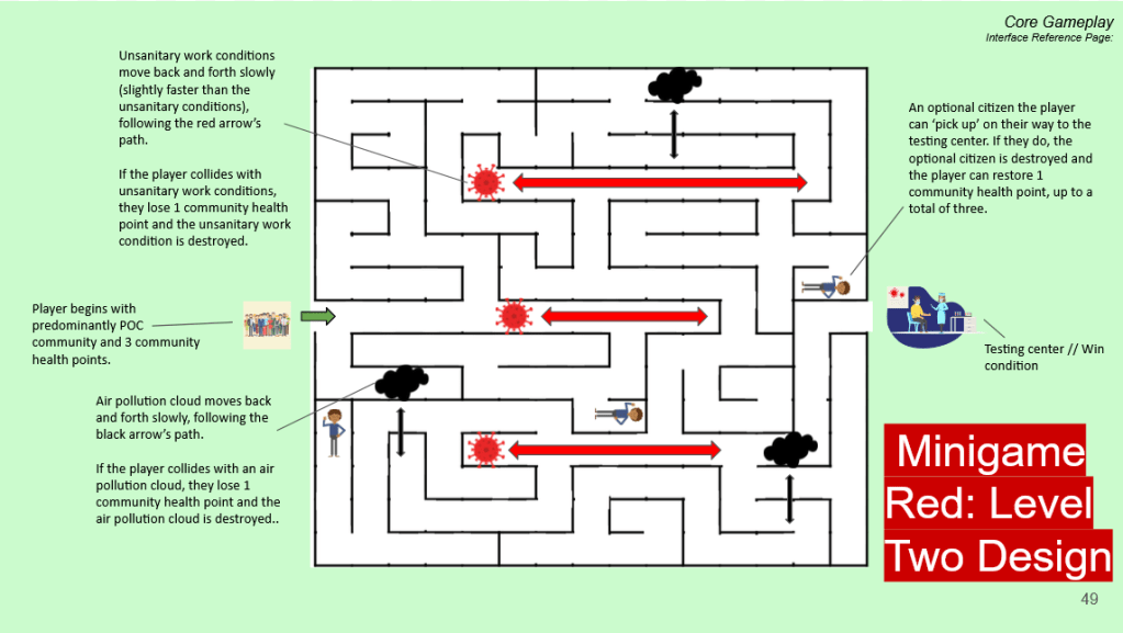 The player must navigate a group of people to a testing center, avoiding obstacles like poor air quality and the COVID-19 virus. The first level (not shown) is a smaller maze with many solutions (depicted as a testing center) and few hazards, showing how it is easier for people in urban areas to get tested and receive treatment. The second level (shown below) is a larger maze with only one solution and more hazards. The size of the mazes are reflective of actual average distances from testing centers for rural vs. urban communities.