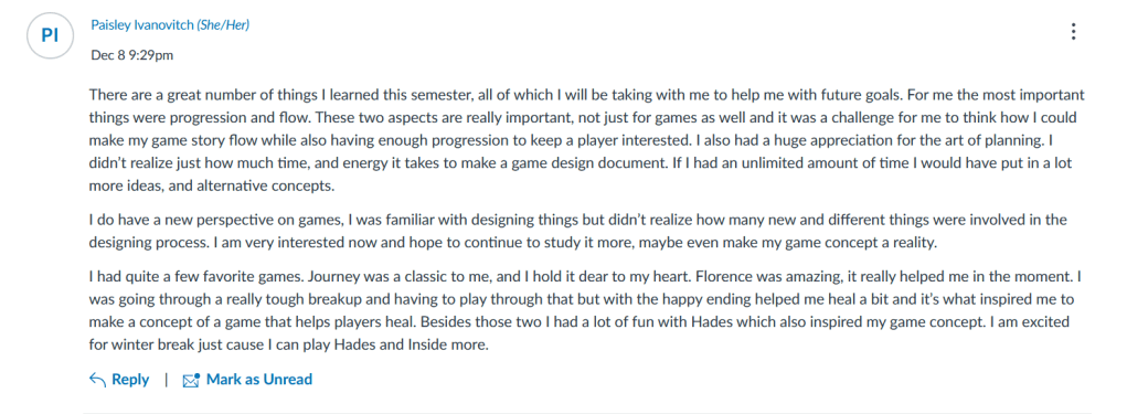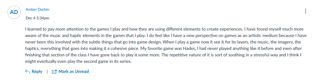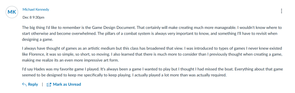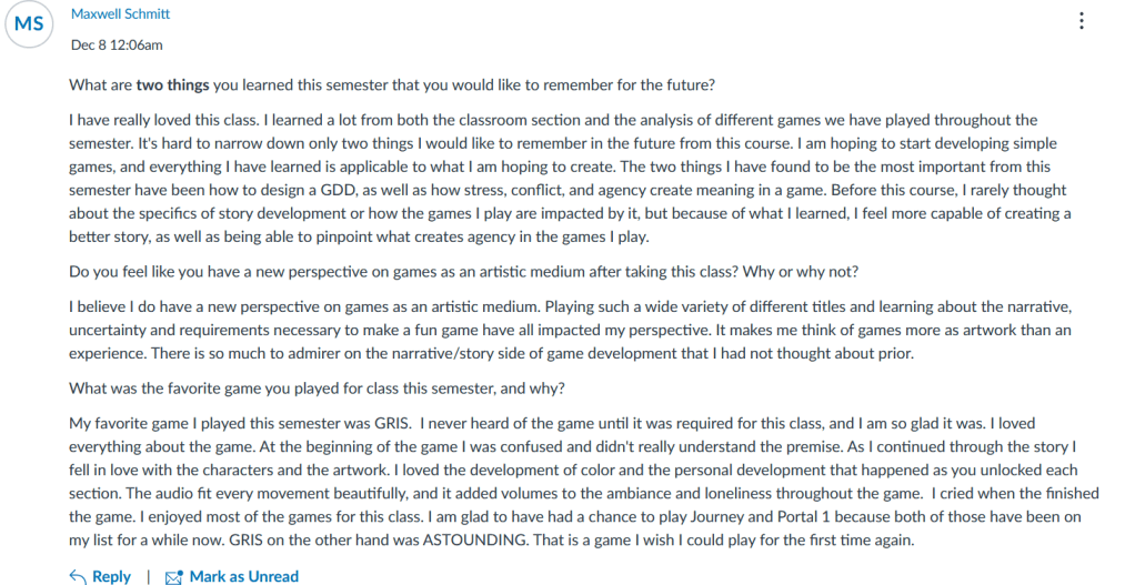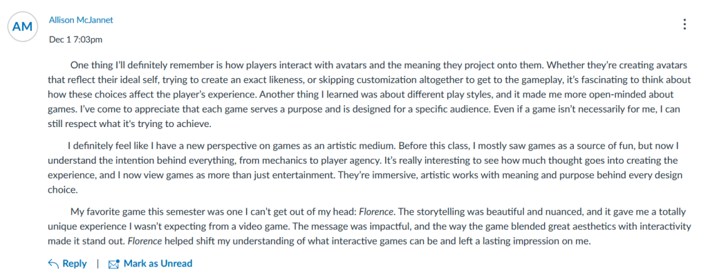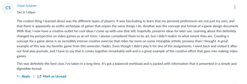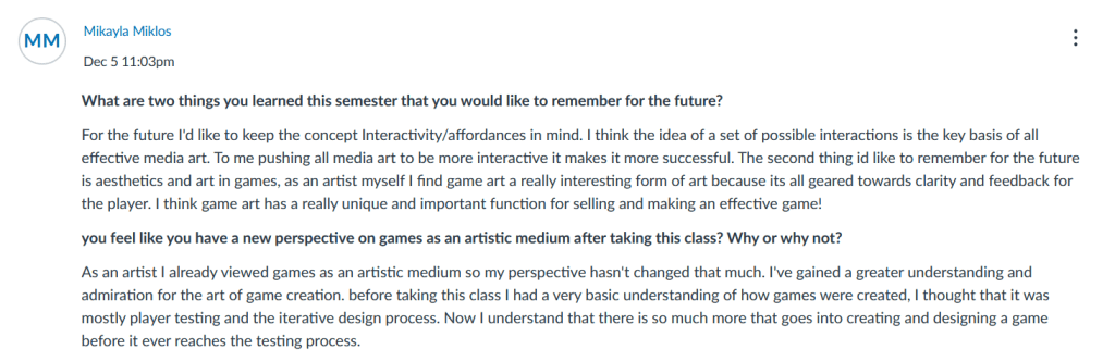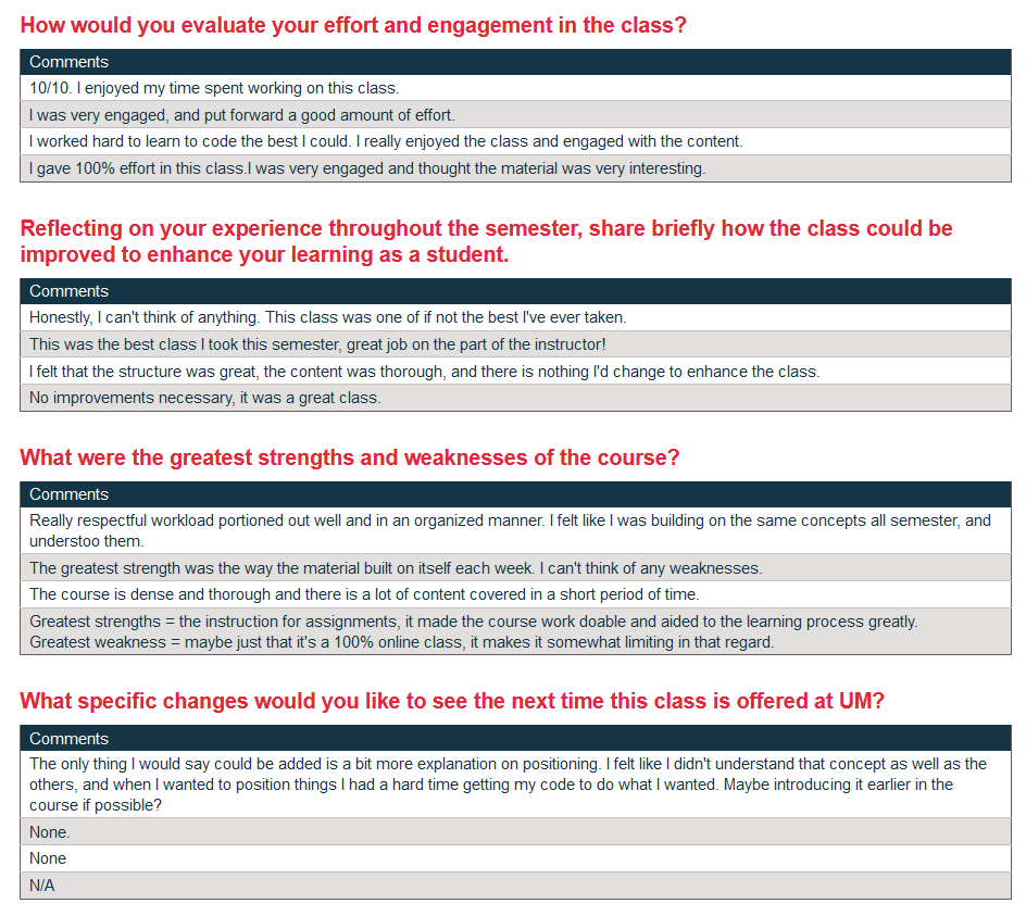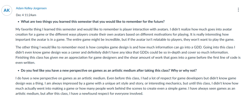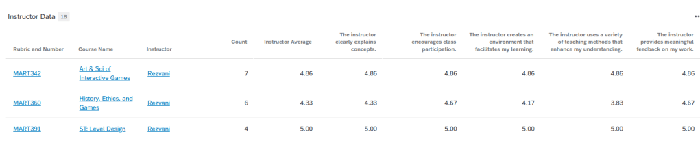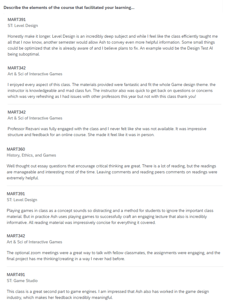 Anonymous course evaluations from Game Ethics, Level Design, Serious Games, and more