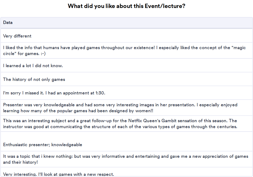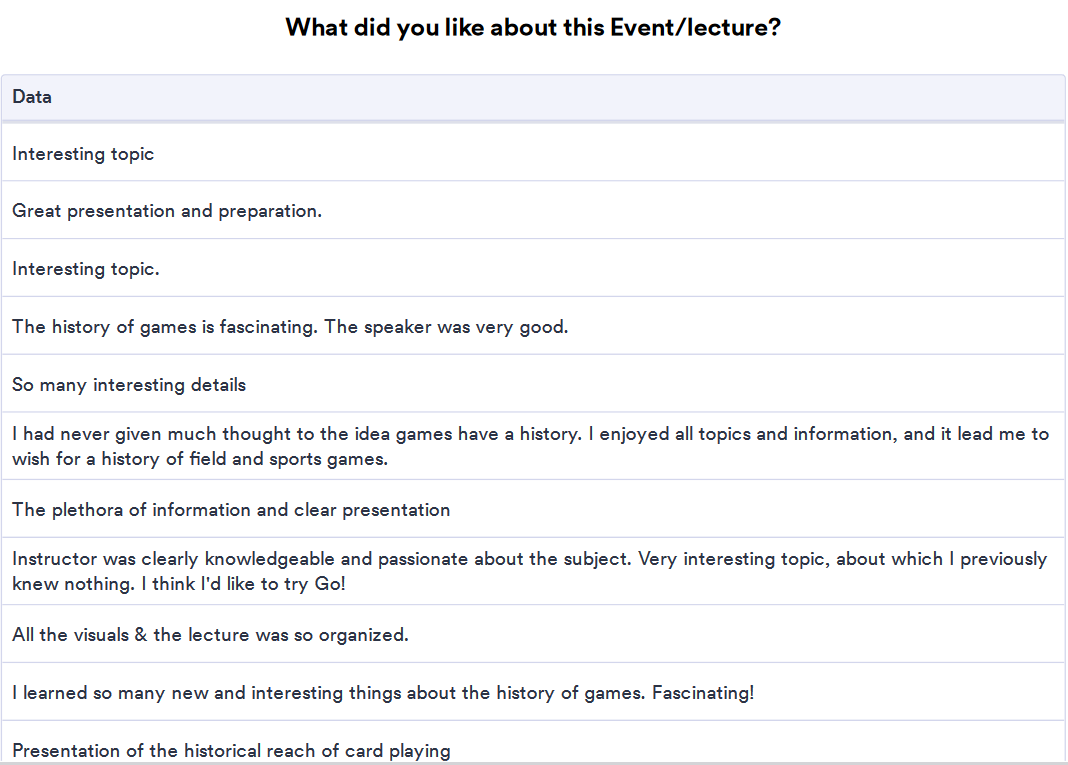 Lecture evaluation for a History of Games lecture given at MOLLI, a 55+ educational service