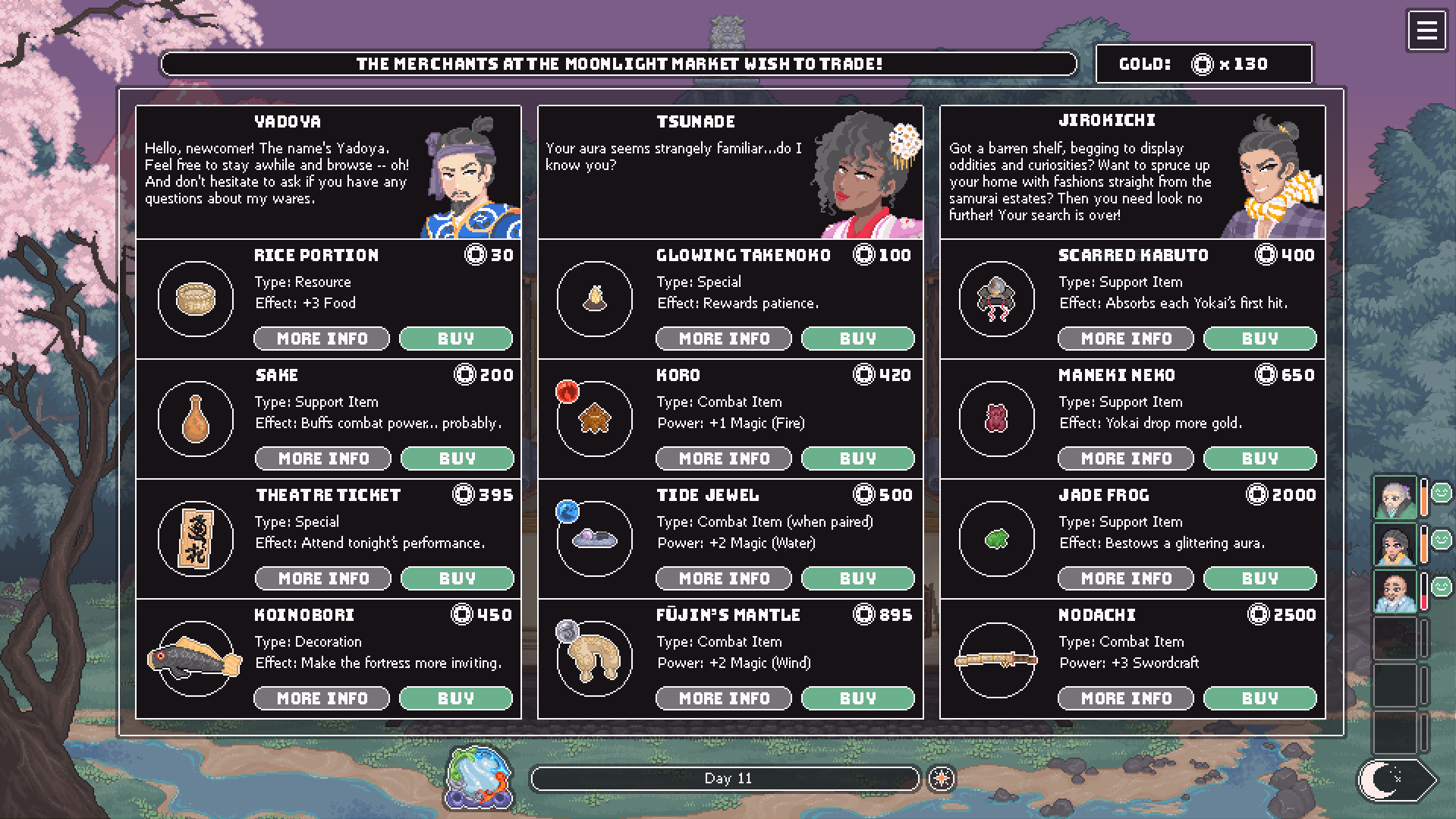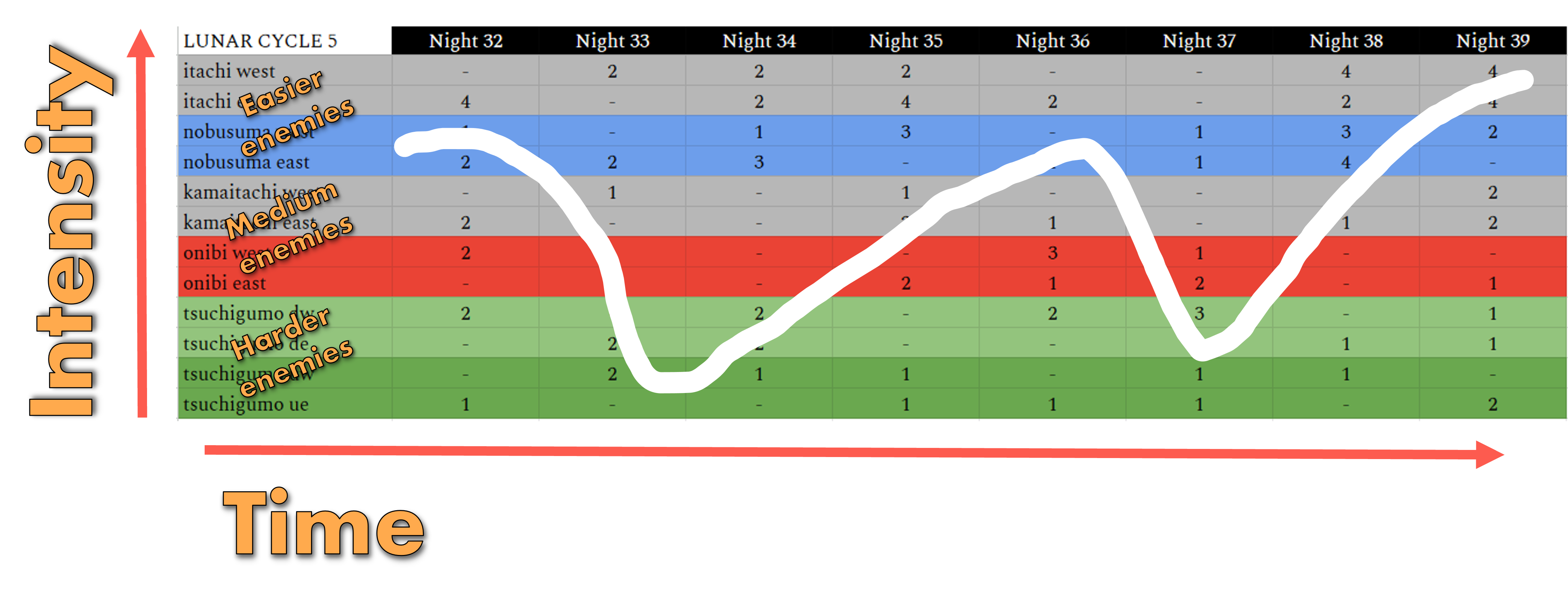 I emphasized pacing gameplay and narrative elements in my approach to Yokai Moon’s level design. This manifested in the intensity of combat each night, the arrival of new villagers, and acquisition of quests and items. I view level design as the art of contrasts; this means that if there was a “low action” day and night then it would be followed with a “high action” day and night.